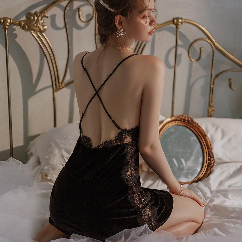 Floral Mesh Lace Hollow Out Side Velvet Nightdress